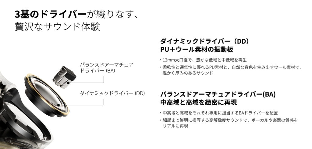 - 12mmダイナミックドライバー+バランスド・アーマチュアドライバー×2による音質
