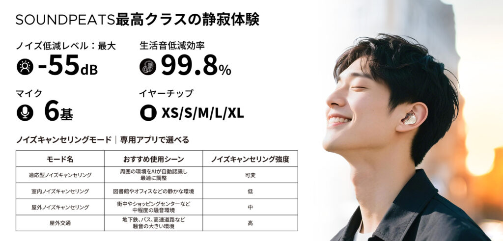 - ノイキャン性能は「-55dB」SOUNDPEATSの中でも最上位クラス